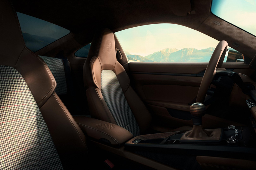 L'intérieur reçoit également des finitions spéciales telles que les bandes centrales des sièges "Grid-Weave F.A." évoquant un tissu à motif de veston entre les bandes latérales en cuir club brun truffe ainsi que des coutures décoratives Beige Calcaire. On retrouve ce tissu dans la boîte à gants ainsi que sur les tapis de sol réversible du coffre à bagages. Le tableau de bord intègre un Chrono Sport dont le design reprend celui de l'original réalisé pour F.A. Porsche. Le levier de vitesse est composé d'un pommeau en bois de noyer stratifié à pores ouverts et d'une plaquette où est gravée la signature du designer. Une autre plaquette dorée, située sur la baguette décorative du tableau de bord, est gravée en fac-similé d'une silhouette d'une 911 et d'une inscription "One of 90". En outre, le coffre de rangement logé dans la console centrale porte la gravure de même design que la plaquette du capot du coffre à bagages.