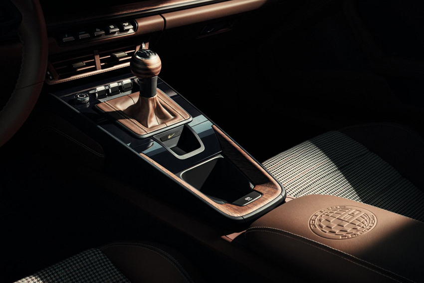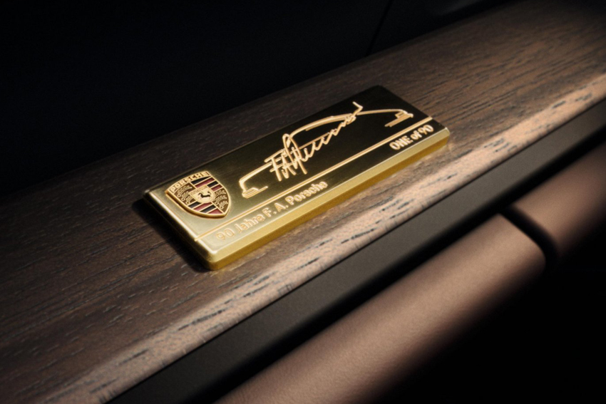 L'intérieur reçoit également des finitions spéciales telles que les bandes centrales des sièges "Grid-Weave F.A." évoquant un tissu à motif de veston entre les bandes latérales en cuir club brun truffe ainsi que des coutures décoratives Beige Calcaire. On retrouve ce tissu dans la boîte à gants ainsi que sur les tapis de sol réversible du coffre à bagages. Le tableau de bord intègre un Chrono Sport dont le design reprend celui de l'original réalisé pour F.A. Porsche. Le levier de vitesse est composé d'un pommeau en bois de noyer stratifié à pores ouverts et d'une plaquette où est gravée la signature du designer. Une autre plaquette dorée, située sur la baguette décorative du tableau de bord, est gravée en fac-similé d'une silhouette d'une 911 et d'une inscription "One of 90". En outre, le coffre de rangement logé dans la console centrale porte la gravure de même design que la plaquette du capot du coffre à bagages.