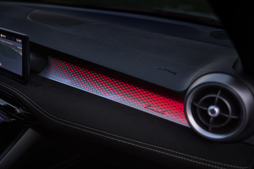 Le style du Tonale gagne en intensité avec des proportions plus sculptées, une voie élargie, un nouveau blason concave, un Trilobe retravaillé et des jantes inédites de 19 ou 20 pouces. Son intérieur se distingue par des finitions renouvelées, notamment l'apparition d'un cuir rouge spécifique et d'un Alcantara bicolor noir et blanc. La console centrale a été modernisée englobant un nouveau sélecteur de vitesse plus ergonomique. Un éclairage d'ambiance à effet dégradé ajoute une touche de sophistication. La vie à bord est également enrichie par une interface 100% numérique composée d'un combiné de 12.3 pouces et d'un écran central tactile de 10.25 pouces. La connectivité sans fil, les mises à jour OTA, les assistances de niveau 2, la caméra 360 degré et le stationnement semi-automatique lui confortent une expérience à la fois intuitive, sécurisante et moderne.