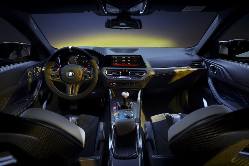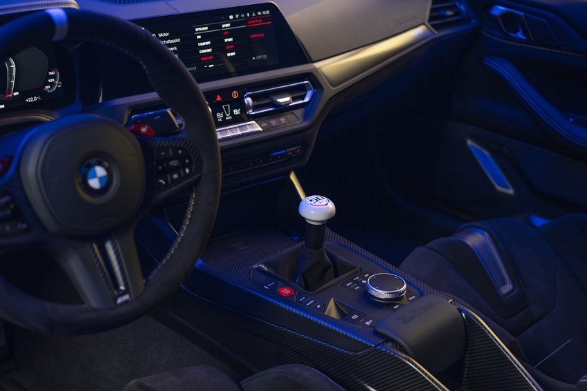 Dans l'habitacle de la BMW 3.0 CSL, les designers ont également utilisé du PRFC (fibres de carbone) et d'autres éléments de construction légère tout en veiller à maintenir cet aspect authentique de compétition. La banquette arrière laisse la place à un espace de rangement avec 2 compartiments intégrés pouvant accueillir des casques. Le design de la garniture des portes et la réduction de l’isolation acoustique contribue aussi à rester dans un esprit sportif. Les sièges en Alcantara sont des baquets Racing M Carbon, avec des inserts sur les appui-têtes amovibles. Le réglage de leur hauteur et de leur inclinaison sur trois niveaux devra s'effectuer exclusivement en atelier par le biais de visseries. Les sièges sont dotés de ceintures de sécurité M. Le volant M en alcantara intègre différents boutons M rouge. D’autres surfaces sont en alcantara noir, alors que le ciel de toit est anthracite. Les surpiqûres contrastées et autres accents blancs correspondent à la teinte extérieure de la BMW 3.0 CSL, dont l'inscription du modèle est estampée dans les garnitures de seuil de porte et les surfaces de siège. Le pommeau de levier de vitesse blanc symbolise l'interaction entre le conducteur et la voiture lors du changement de vitesse.