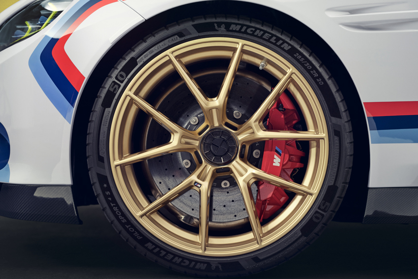 La suspension a été remaniée et comprend un essieu avant à jambes de force à double articulation et un essieu arrière à cinq bras de conception spécifique M, complété par une suspension SelectDrive M avec amortisseurs à commande électronique, une direction M à assistance variable et des freins M Carbon céramiques réglables. Ces derniers sont composés d’étriers fixes à six pistons avec des disques en céramique de 400x38 millimètres à l'avant et d’étriers fixes à un piston avec des disques de 380x28 millimètres à l'arrière. Les étriers de frein sont peints en rouge. Le système de freinage intégré offre deux réglages pour la sensation de la pédale, qui peuvent être sélectionnées dans le menu M Setup.