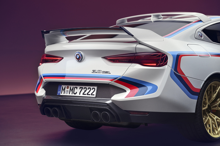 Ce coupé aux proportions classiques comprend de larges passages de roues et reçoit un pack aérodynamique spécifique et inédit comprenant un pare-choc avant très marqué, des grilles d'aération sur les panneaux latéraux avant, un aileron de toit et un aileron arrière. Sa calandre avant est typique de BMW sont le cadre, ainsi que ceux des encadrements des vitres latérales, est en aluminium satiné. Associés à la calandre BMW, deux renfoncements généreusement dimensionnés dans la jupe avant permettent une prise d’air assurant un refroidissement efficace du moteur et des freins, refroidissement appuyé par des prises supplémentaires sur le capot. Les passages de roues élargis permettent le montage de jantes forgées en alliage léger à rayons en Y de couleur dorée de 20 pouces sur l’essieu avant et de 21 pouces à l’arrière. Elles sont chaussées de pneumatiques Michelin développés exclusivement pour la BMW 3.0 CSL. Le design arrière offre un visuel sur les 4 sorties d’échappement en titane dans la jupe arrière. Les feux arrière bénéficie de l’introduction d’une nouvelle technologie d'éclairage afin de générer une image nocturne exclusive ainsi qu'un rayonnement particulièrement vif grâce à des fils lumineux laser en filigrane.